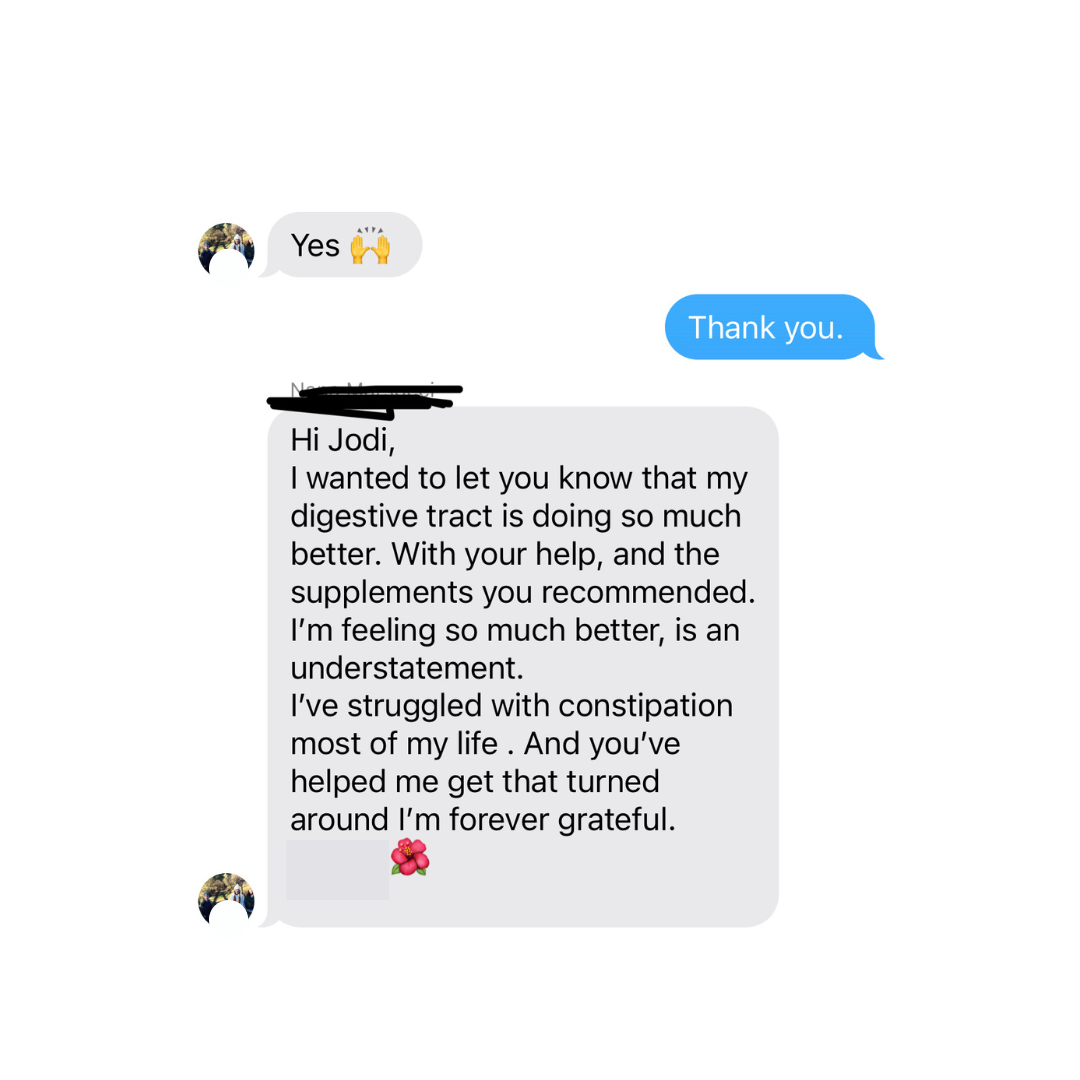 "Jodi is amazing! She takes the time to listen and really understands what the body is saying. I had been suffering from Chronic gut issues for most of my life and had been to several specialists, had colonoscopies the works and was ALWAYS told its all normal just eat more fiber. Literally gave up and thought this is what I have to deal with for the rest of my life. Gut Misery!"